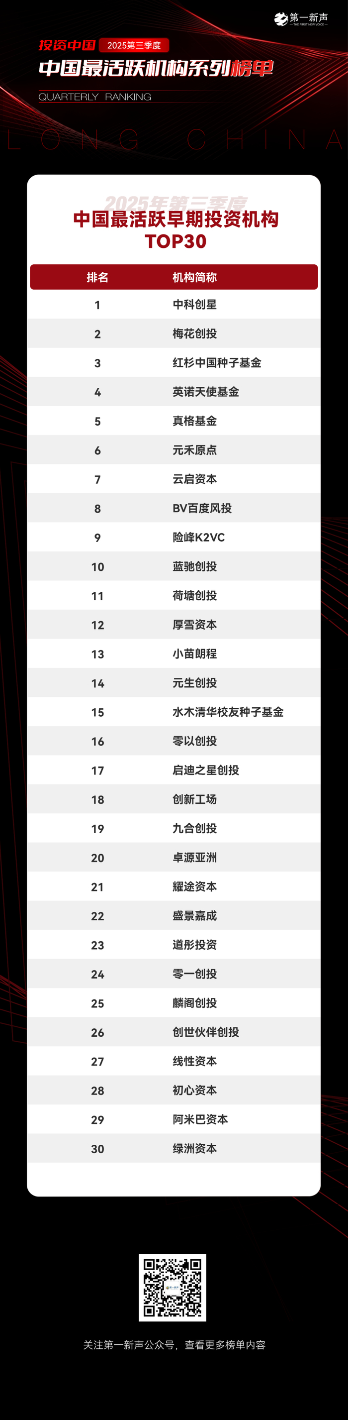 10 月 29 日,第一新声发布 2025 年 Q3 中国最活跃机构系列榜单,真格基金上榜「中国最活跃早期投资机构 TOP30」,排名第 5;「人工智能最活跃投资机构 TOP10」;「大消费最活跃投资机构 TOP5」。