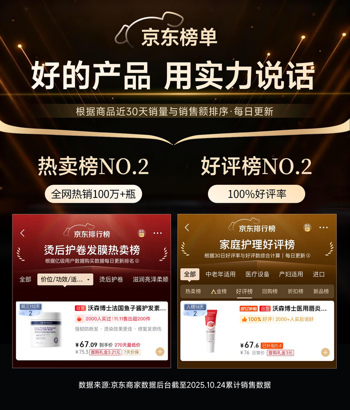 京东平台:沃森博士DR.WOSSEN法国鱼子酱护发素已连续112天稳居“烫后护卷发膜热卖榜TOP2”;沃森博士DR.WOSSEN医用唇炎修复膏荣登“家庭护理好评榜TOP2”,好评率高达100%,彰显品牌在医用修复领域的专业实力。