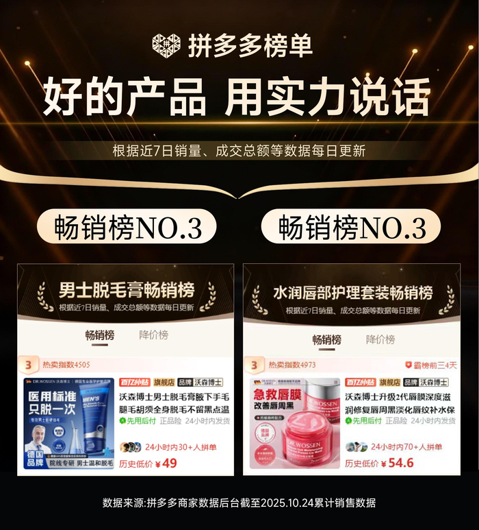 拼多多平台:沃森博士DR.WOSSEN男士脱毛小蓝管跻身“男士脱毛膏畅销榜TOP3”,沃森博士DR.WOSSEN升级2代唇膜也成功进入“水润唇部护理套装畅销榜TOP3”,这些成绩表明,沃森博士DR.WOSSEN在细分个护赛道均已取得领先地位。