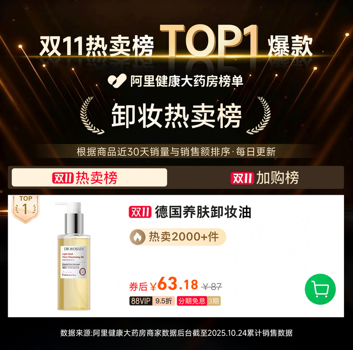 阿里健康平台:沃森博士DR.WOSSEN轻盈净透卸妆油一举登顶“卸妆热卖榜TOP1”,成为该平台最具影响力的卸妆产品。