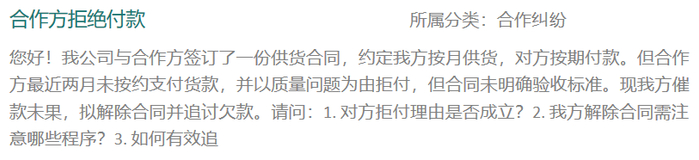 若双方签订的供货合同中对合同解除的情形进行了约定,则可以依约定解除。如果未进行约定,你可以催告对方在合理的期限内支付货款,经催告后依然拒绝付款,依据《民法典》第五百六十三条,当事人一方迟延履行主要债务,经催告后在合理期限内仍未履行,你可以依法与其解除合同,同时可以通过人民法院诉讼等司法途径追回货款。但要提醒的是,作为卖方,你有向买方提供符合质量要求货物的义务,如果你的货物确实存在产品质量问题,可能会面临被供货方反诉及索赔的法律风险。
