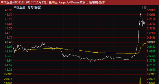 航天装备概念股临近收盘集体拉升。下午2点半左右,板块指数由跌逾3%,仅用约15分钟放量拉升至涨逾2%。同时间内,中国卫星(600118)由跌逾3%直线拉升一度涨逾5%,中国卫通、中天火箭、航天电子等尾盘均出现异动拉升走势。