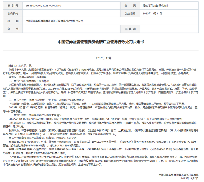 监管部门指出,林艺平的行为违反了《私募投资基金监督管理暂行办法》《私募投资基金监督管理条例》的相关规定,构成利用未公开信息交易股票的违法行为。依据《基金法》等相关规定,浙江证监局责令林艺平改正,给予警告,没收违法所得8857.69万元,处以同等金额罚款,合计罚没金额达1.77亿元。同时因其违法行为情节严重,对其采取5年证券市场禁入措施。