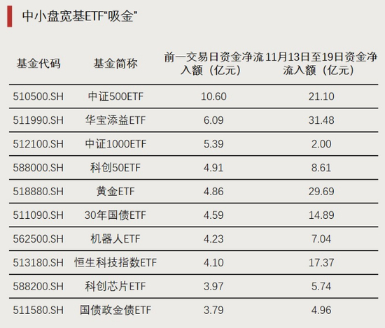 前一交易日(11月19日),宽基ETF依然是资金青睐的一大主流品种。资金净流入前十的ETF中,宽基ETF数量居多。其中,中小盘宽基ETF颇受追捧。