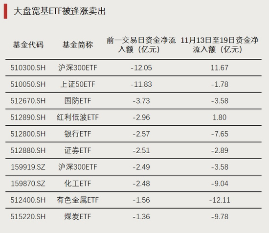 部分大盘宽基ETF则在11月19日遭较多资金净卖出,多只产品净流出金额跻身市场前十。其中,挂钩沪深300和上证50的各有1只ETF净流出超过10亿元。