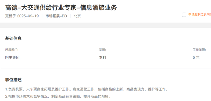《21CBR》记者留意到,扫街榜推出9天后,高德开始招聘“大交通供给行业专家”,负责机票、火车票商家拓展及维护工作。