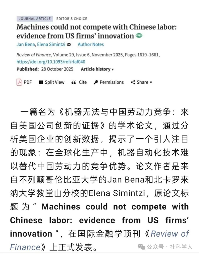 一篇名为《机器无法与中国劳动力竞争:来自美国公司创新的证据》的学术论文,通过分析美国企业的创新数据,揭示了一个引人注目的现象:在全球化生产中,机器自动化技术难以替代中国劳动力的竞争优势。