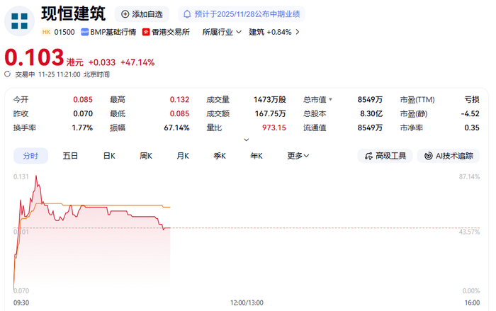 港股市场大幅波动的个股中, 现恒建筑大涨,盘中涨幅一度超过80%。