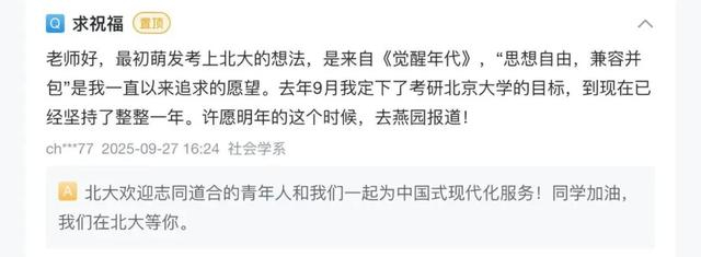 除了问题咨询,不少同学发来“许愿帖”求祝福,老师也会认真回复大家。