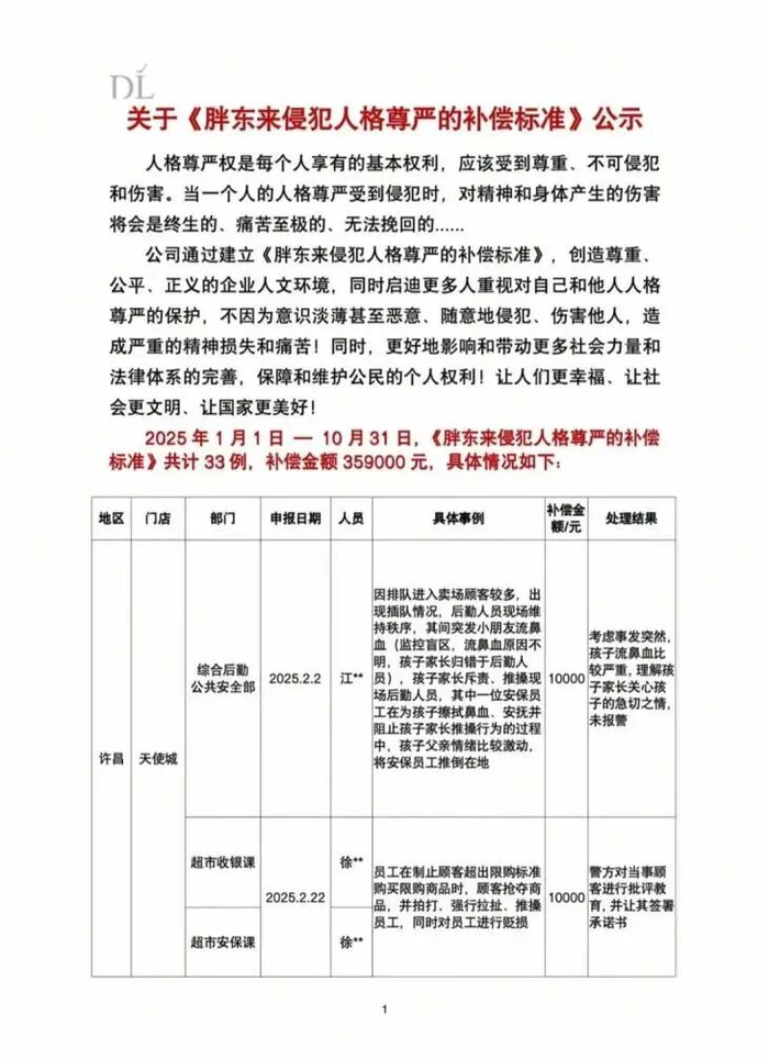 值得一提的是,就在11月17日,胖东来官方账号才公示了《胖东来侵犯人格尊严的补偿标准》。
