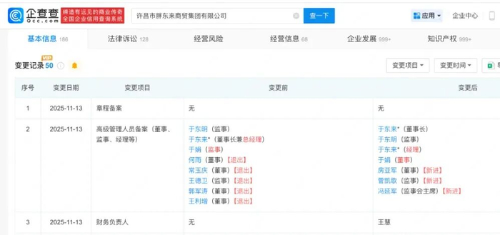 企查查显示,许昌市胖东来商贸集团有限公司的工商登记信息更新,于东来不再担任总经理职务,但仍保留董事长和经理身份;