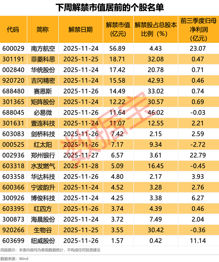 一般而言,业绩亏损股的解禁压力相对较大,下周的解禁股中,红太阳、水发燃气、中望软件、生物谷、久其软件、必易微前三季度业绩呈现亏损。