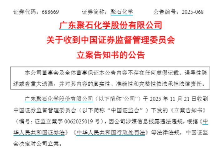 11月21日晚间,聚石化学(688669)公告称,公司于当日收到证监会下发的《立案告知书》,因公司涉嫌信息披露违法违规,证监会决定对公司立案。