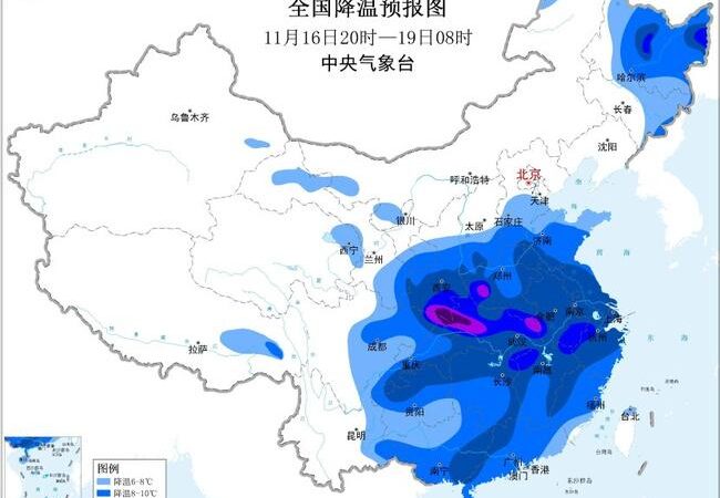 寒潮蓝色预警:中东部地区日平均或最低气温将普遍下降6至10℃